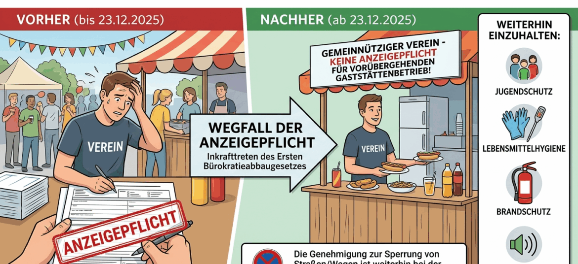 Mit dem Inkrafttreten des Ersten Bürokratieabbaugesetzes des Landes Hessen zum 23. Dezember 2025 entfällt die bisherige Pflicht zur Anzeige eines vorübergehenden Gaststättenbetriebs durch gemeinnützige Organisationen. Diese Änderung betrifft insbesondere Vereine, Initiativen, Bürgergruppen sowie ehrenamtliche Zusammenschlüsse.