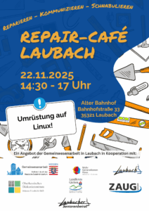 22.11.2025 @ 14:30 Uhr – 17:00 Uhr – „Reparieren, kommunizieren, schnabulieren“: Repair-Café Laubach – Letzter Termin vor der Winterpause Am 22.11.2025 öffnet das Repair-Café in Laubach von 14:30 Uhr bis 17 Uhr im Alten Bahnhof seine Türen, bevor es in die wohlverdiente Winterpause geht. Auch dieses Mal besteht die Möglichkeit, Laptops oder Desktop-Computer durch Dr. Diego Semmler auf Linux umrüsten zu lassen. Wichtig: […]
