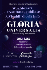 28.11.2025 @ 18:30 Uhr – 19:30 Uhr – Einladung zur offenen Generalprobe! „Gloria Universalis“ so heißt das neue Konzertprogramm des Alis Canticum, der Harmonie Münster e.V. Gleich zwei Werke kommen zu Gehör: 1. Mozart Exsultate, Jubilate, eine Motette die gerade mal von dem 17- jährigen Mozart komponiert wurde. Gesungen von der Sopranistin Viktoria Bohdanova und begleitet von Musikern des Camerata Mittelhessen. 2. Vivaldi […]